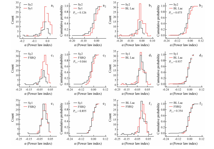 分别将活动星系核的4个子类的幂律指数统计分布图进行比较:Ⅱ型塞弗特星系(Sy2)和Ⅰ型塞弗特星系(Sy1),Ⅱ型塞弗特星系和蝎虎天体,Ⅱ型塞弗特星系和平谱射电类星体,Ⅰ型塞弗特星系和蝎虎天体,Ⅰ型塞弗特星系和平谱射电类星体,蝎虎天体和平谱射电类星体;再将各子类的幂律指数累积归一化图进行比较,其比较结果如图 2,左边是幂律指数统计分布对比图,右边是幂律指数累积归一化对比图。