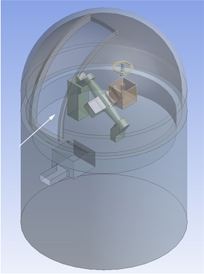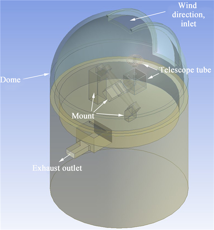 | 图 4 计算流体动力学简化模型,包括圆顶、转台、镜筒和流体域 Fig. 4 Simplified model in CFD, including dome, mount, tube and fluid domain |