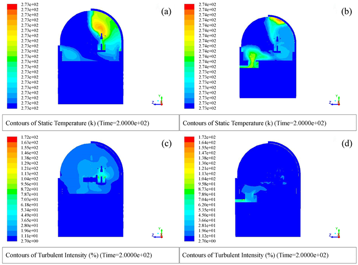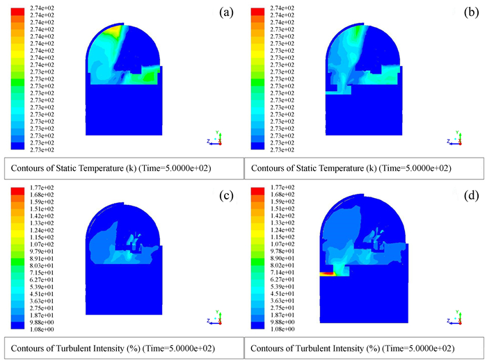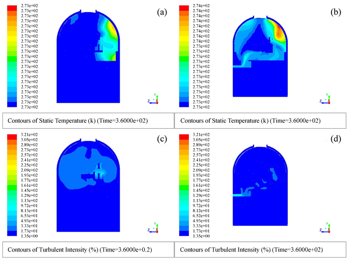 | 图 5 天窗开口与通风口夹角180°时((a), (b))温度与((c), (d))湍流强度分布,((a), (c))无通风与((b), (d))主动排风 Fig. 5 Contour maps for slit-vent angle=180° of ((a), (b))temperature and ((c), (d)) turbulent intensity distribution, ((a), (c))without vent and ((b), (d))with vent |