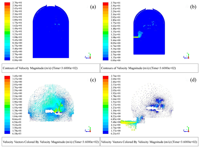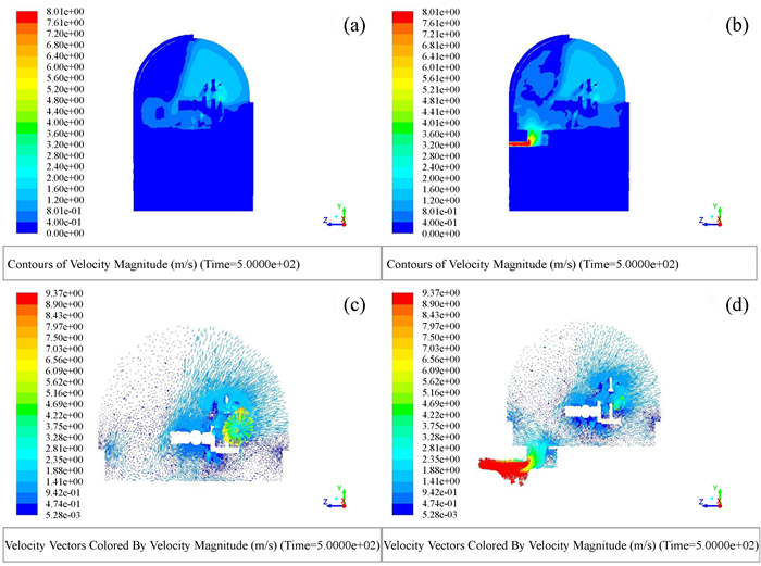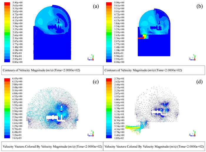 | 图 6 天窗开口与通风口夹角180°时((a), (b))风速与((c), (d))矢量分布,((a), (c))无通风与((b), (d))主动排风 Fig. 6 Contour maps for slit-vent angle=180° of ((a), (b))velocity and ((c), (d)) vector distribution, ((a), (c))without vent and ((b), (d))with vent |