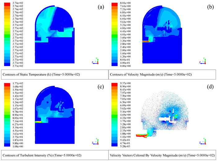3.4 排风机风量影响分析当排风机风量发生变化时,势必造成圆顶内湍流情况的改变。因此,对不同风量情况进行分析有助于风机选型,仿真参数同3.1节,天窗开口与通风口夹角为0°,圆顶朝西。设置出风口风速为9 m/s,每小时换气约6次,比前文设置的风速略低。在此情况下,主动排风时560 s左右达到温度平衡。为了便于对比,仍然取第500 s时刻进行分析。