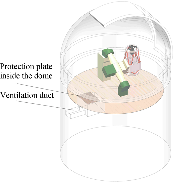 兴隆观测基地2.16 m光学天文望远镜于1989年投入使用,其半球型圆顶直径23 m,高15 m,圆顶墙体有低热容量的加气混凝土保温墙和对流区域[1-2]。由于2.16 m望远镜使用的英国式赤道仪需要较大的回转空间,因此,望远镜的圆顶体积很大,约5 600 m3。圆顶体积过大带来了高热容积的问题,仅靠少数排风系统难以快速达到圆顶内外空气热平衡,且由圆顶天窗进入的自然风会在圆顶内部产生湍流现象。因此,望远镜的观测精度受到圆顶视宁度的影响。