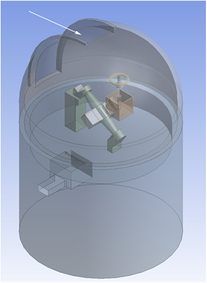 2.16 m圆顶内有一供主镜镀膜的吊装通道,约4 m × 3 m。若将其改造为通风口,可以与天窗开口形成对流,大大增加通风效率,提高望远镜的观测质量。本文对吊装通道改造为通风口进行了设计,并使用计算流体动力学(Computational Fluid Dynamics, CFD)软件①对通风效果进行分析,对比通风口存在与否情况下的通风效果,为2.16 m望远镜圆顶通风改造提供参考依据。