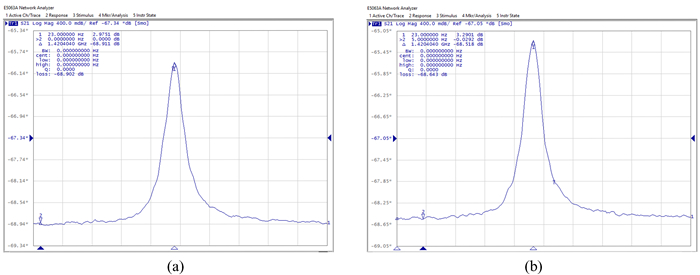 在实验过程中,磁屏蔽系统已使用大电流退磁,处于已退磁状态。谐振腔的微波输入功率为-90 dBm,微波腔谐振频率调节至原子跃迁频率附近,1 420.405 751 MHz ± 5 KHz,两个线圈产生的C场大小均约为1mGauss。直螺线管线圈作用下的氢原子(0-0)跃迁信号增益为2.975 1 dB,九段线圈作用下的氢原子(0-0)跃迁信号增益为3.290 1 dB,九段线圈信号增益较直螺线管增加0.315 0 dB,提升效果明显,两者对比如图 5。