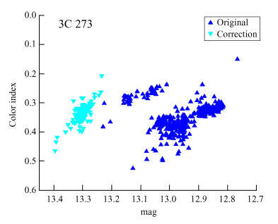 | 图 1 3C 273的色指数与星等关系图 Fig. 1 The relation between the color index and mag of 3C 273 |