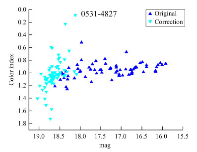 | 图 10 0531-4827的色指数与星等关系图 Fig. 10 The relation between the color index and mag of 0531-4827 |