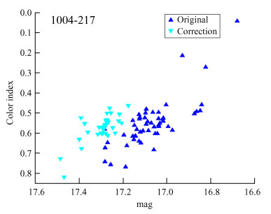 | 图 11 1004-217的色指数与星等关系图 Fig. 11 The relation between the color index and mag of 1004-217 |