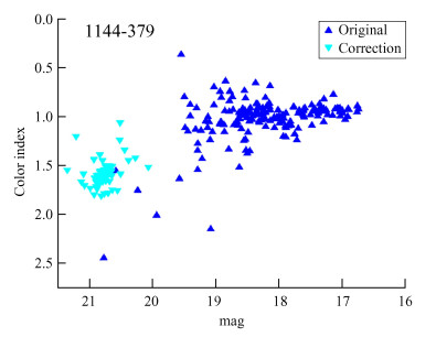 | 图 12 1144-379的色指数与星等关系图 Fig. 12 The relation between the color index and mag of 1144-379 |