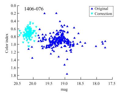 | 图 13 1406-076的色指数与星等关系图 Fig. 13 The relation between the color index and mag of 1406-076 |