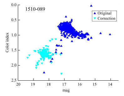 | 图 15 1510-089的色指数与星等关系图 Fig. 15 The relation between the color index and mag of 1510-089 |