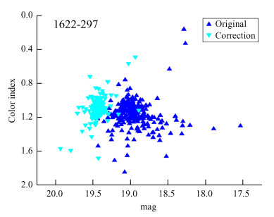 | 图 16 1622-297的色指数与星等关系图 Fig. 16 The relation between the color index and mag of 1622-297 |
