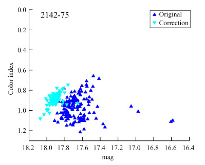 | 图 18 2142-75的色指数与星等关系图 Fig. 18 The relation between the color index and mag of 2142-75 |