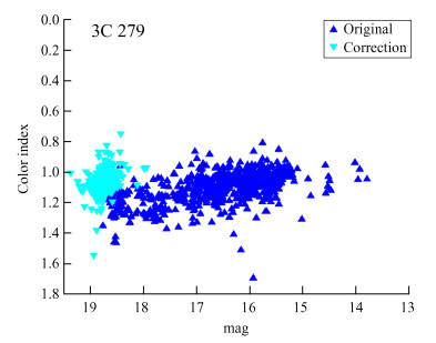 1.2 色指数分析利用准同时数据得出19个源的色指数,计算了色指数与星等的相关关系。S5 0716 + 714在微光变时标、短时标和长时标内都发现了颜色变蓝的趋势;Mrk 501在中时标、短时标和微光变时标上具有颜色变蓝的趋势[19];耀发期的光谱指数与非耀发期的光谱指数不同[20],因此,色指数的变化可能与源的活动状态和时标有关。同时宿主星系、吸积盘成分的影响以及重力微透镜也会造成明显但不切实际的颜色变化[21-22]。因此,利用调整流量基准面的方法修正流量与色指数,对比修正前后色指数与星等相关关系的差别,从而研究多普勒效应对耀变体色指数的影响。调整流量基准面[10-12]的方法如下:(1)为了去除密集采样的影响,将流量进行4天的合并,而后利用合并的数据进行3次样条插值,这样就得到了消除长期趋势后的流量值。由于SMARTS网站公布的是观测源的星等,在计算前利用