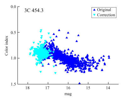 研究修正前后的色指数(B-R)与R波段星等(R)之间的关系。假设色指数为Y,星等值为X,则Y=a+bX。表 1和表 2分别是修正前后星等和色指数的相关关系,其中,a为截距;b为斜率;r为相关系数;p为置信度(P < 0.05认为相关);n为每个源对应的样本数量。色指数为Y,星等值为X的线性关系图如图 1至图 19。研究结果表明,调整流量基准面后的数据点集中在原始数据点的左侧。在修正前,根据色指数和星等之间的相关关系可以发现,源3C 279,0454-234,0528+134,1004-217和1144-379具有明显的颜色变蓝的趋势,而源3C 454.3,0402-362具有明显的越亮越红的趋势。修正后的结果表明,15个源有颜色变蓝的趋势,只有3C 454.3,0250-225,1406-076和1510-089没有表现出颜色变蓝的趋势。应该注意到颜色相关关系的弥散都很大。