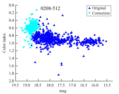 | 图 4 0208-512的色指数与星等关系图 Fig. 4 The relation between the color index and mag of 0208-512 |