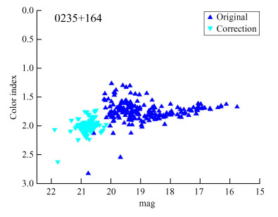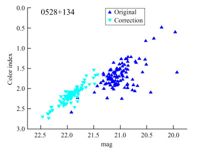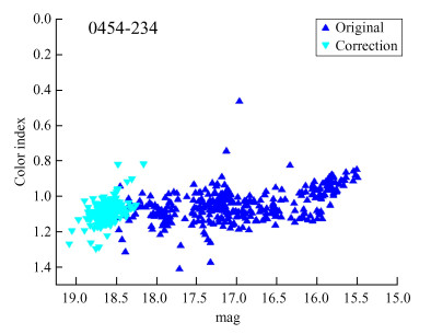 | 图 8 0454-234的色指数与星等关系图 Fig. 8 The relation between the color index and mag of 0454-234 |