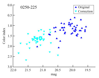 | 图 6 0250-225的色指数与星等关系图 Fig. 6 The relation between the color index and mag of 0250-225 |