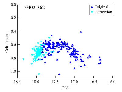 | 图 7 0402-362的色指数与星等关系图 Fig. 7 The relation between the color index and mag of 0402-362 |