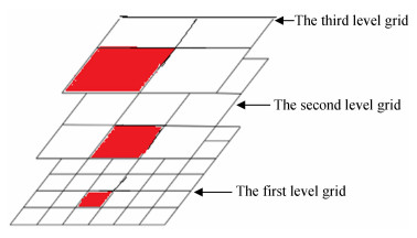 2.1 多重网格技术基本原理多重网格的基本思想是建立多层次、不同尺寸的网格,通过这些网格在不同范围内搜索需要的目标值[5]。如图 1,搜索空间划分为L层,每层网格由边长相同的单元格构成,单元格的边长称为搜索步长,每个单元格的结点表示不同的搜索值。在划分过程中,随着网层号的降低,网格尺寸减小,搜索精度提高。