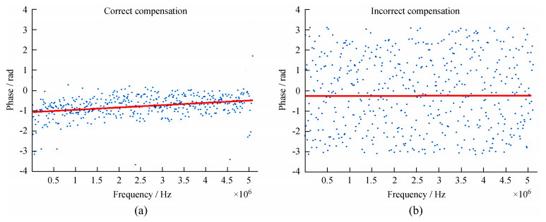 由(10)式可知,若补偿准确,互相关功率谱的相位与频率呈线性关系,斜率表示残余时延。如图 4(a)表示时延和时延率补偿与实际时延和时延率相近的相位结果,补偿不准确的时延和时延率的相频图如图 4(b)。