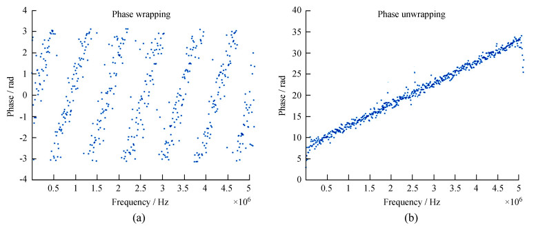 通过上面的分析可知,因为两台站信号互相关功率谱的相位超出(-π, π)而导致相位卷绕现象。为了准确表示互相关功率谱的相位,需要对相位进行解卷绕处理。解卷绕方法为规定跳变阈值,当相位跳变超过阈值时,将相位进行迁移,使截断的相位连接在一起[9],解卷绕后的相位如图 5(b)。