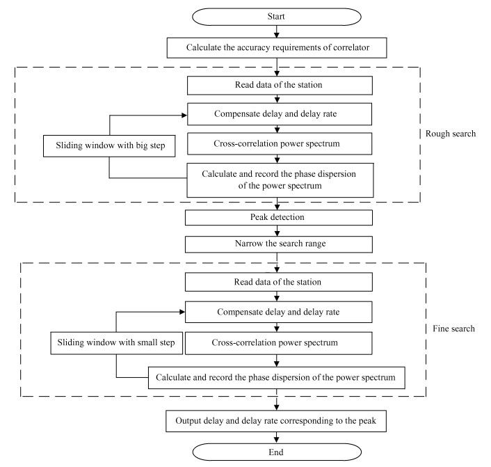 2.3 多重网格条纹搜索流程图 6是多重网格条纹搜索的具体流程。首先需要计算相关处理机的精度,确定粗搜索的时延和时延率补偿的搜索步长,读取台站记录的信号,解码后在绝对时间上对齐,固定台站1信号,对台站2信号进行粗搜索的滑窗处理,完成时延和时延率的补偿后计算互相关功率谱,搜索到互相关功率谱弥散程度最小的位置,缩小搜索范围,以满足精度要求的搜索步长进行相关处理,在信号相关后得到互相关功率谱,提取相位。计算每组时延、时延率对应相位的方差并记录,最后将记录的方差结果绘制输出,选取峰值对应的时延、时延率,最终得到精确的时延、时延率并输出。