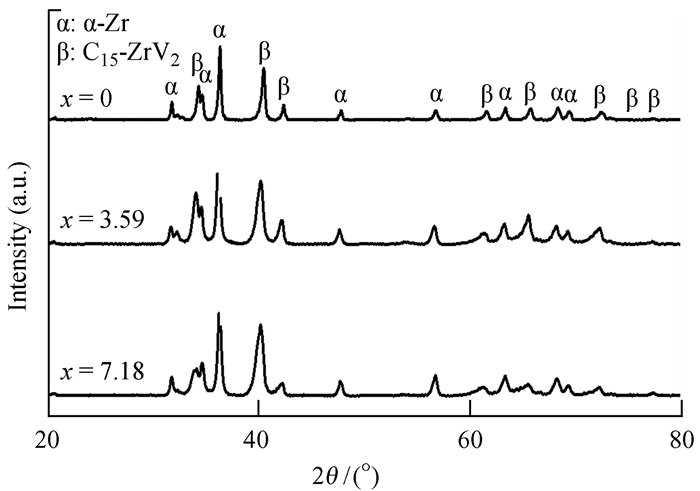 3 结果与讨论 3.1 合金的相结构分析图 2是Zr56.97V35.85Fe7.18-xCrx (x=0, 3.59和7.18) 的X射线衍射仪图谱。从图 2可以看出,在Cr含量从0变化到7.18的过程中,合金的相结构没有发生变化,主要由α-Zr和C15-ZrV2两相组成,两相均为吸氢相。对合金的晶体结构参数进行计算[19]发现,C15-ZrV2相的晶胞体积随着Cr含量的增加逐渐增大,这是由于Cr原子的半径(0.185 nm) 大于Fe原子的半径(0.172 nm),在固溶体中增加大原子半径的元素含量时,晶格常数增大。合金原子之间的间隙变大,使氢原子的扩散加快,提高了吸氢速率。