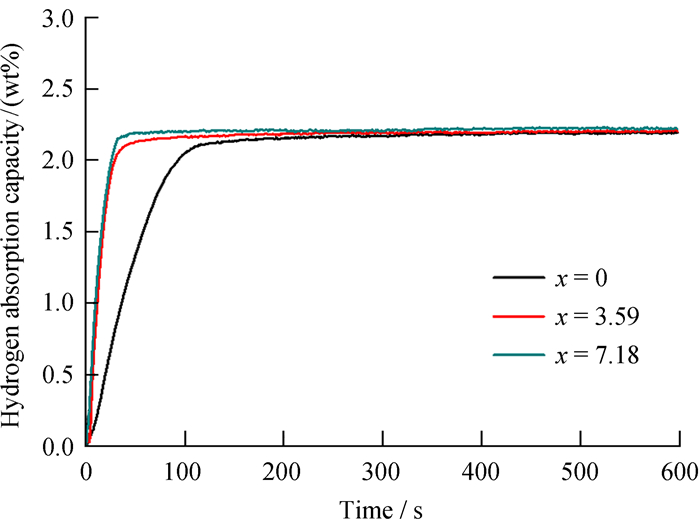 3.3 合金的储氢性能合金吸氢的动力学特性通常用最大吸氢量90%所用的时间(t0.9) 来表示。图 4为Zr56.97V35.85Fe7.18-xCrx (x=0, 3.59和7.18) 合金在298 K时的吸氢动力学曲线。对该系列合金的吸氢动力学性能研究发现,随着Cr含量增加,合金的吸氢动力学性能逐步提升。Cr含量分别为0,3.59和7.18时,吸氢合金的t0.9分别为90 s,40 s和25 s。