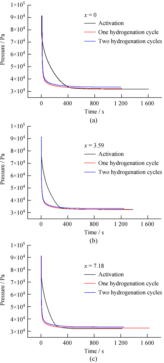 | 图 5 Zr56.97V35.85Fe7.18-xCrx吸氢合金的活化性能曲线。(a) x=0; (b) x=3.59; (c) x=7.18 Fig. 5 Activation Curve of Zr56.97V35.85Fe7.18-xCrx. (a) x=0; (b) x=3.59; (c) x=7.18 |