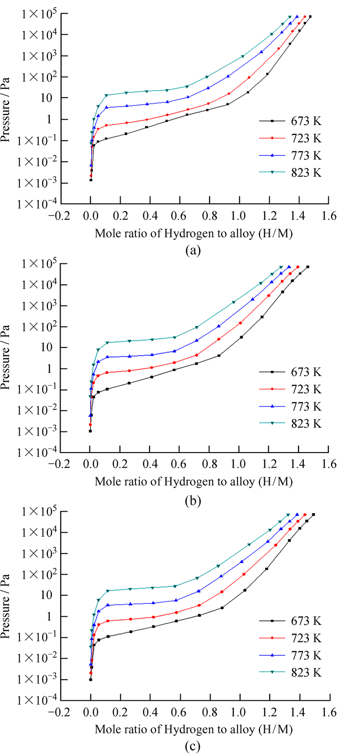 图 6给出了Zr-V-Fe-Cr系列合金样品在673 K,723 K,773 K和823 K条件下的吸氢压力-容量-温度曲线。其中横坐标是氢含量(H/M),纵坐标为平衡时氢气的压力。从图 6可以看出,随着温度上升,平台压逐渐上升。压力-容量-温度曲线中的α相阶段为0~0.1 (H/M),合金形成α固溶体的阶段非常短暂,在这个阶段主要是氢气吸附在合金表面以及氢逐渐进入合金间隙形成固溶体的过程。在此过程中,合金的表面形状和组织形貌不发生变化,合金硬度提高,不会发生粉化现象。压力-容量-温度曲线中的(α+β) 相阶段为0.1~0.7 (H/M),在这个阶段,α相逐渐转变为β相,此时合金晶胞参数逐渐增大,合金生成氢化物相并逐渐粉化。当大于0.7 (H/M) 时,随着氢含量的增加,β相逐渐接近化学计量组成,此时主要是氢原子在金属氢化物晶胞中的内扩散过程[24]。
