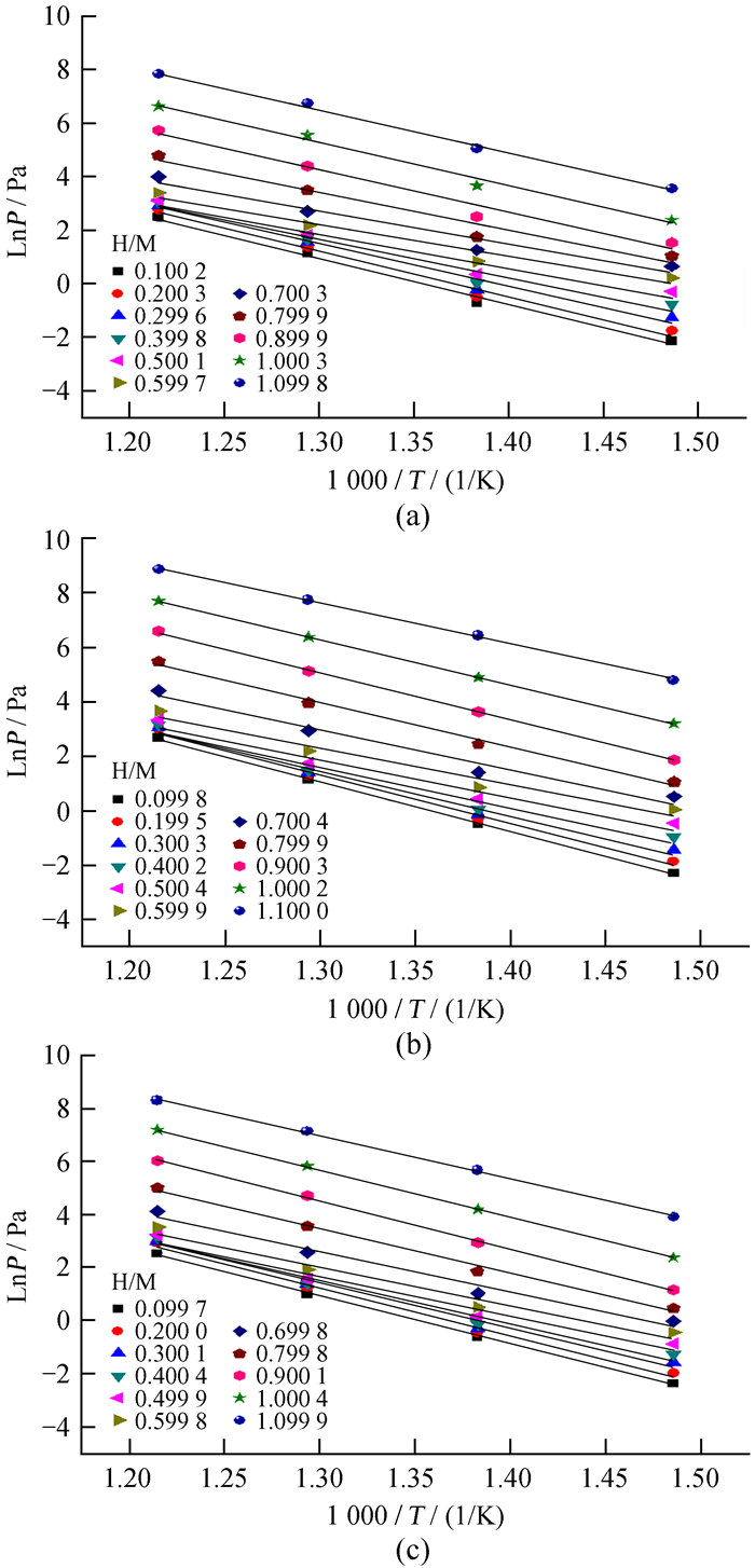 | 图 7 Zr56.97V35.85Fe7.18-xCrx系列合金吸氢范特霍夫拟合曲线。(a) x=0; (b) x=3.59; (c) x=7.18 Fig. 7 Van′t Hoff fitting curve of Zr56.97V35.85Fe7.18-xCrx alloy. (a) x=0; (b) x=3.59; (c) x=7.18 |