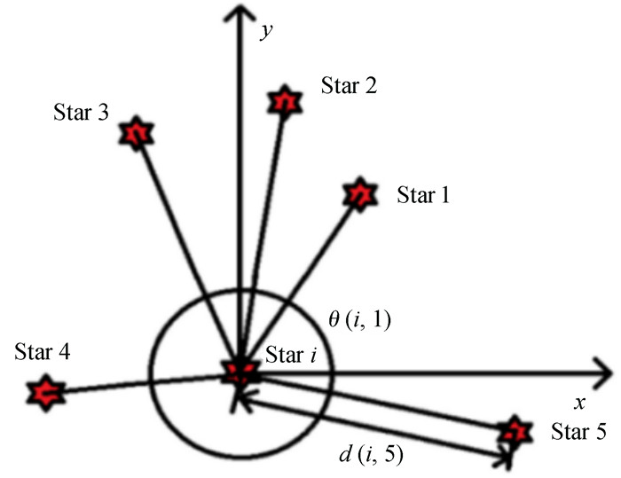 2.1 星像特征向量集的建立建立星像的特征向量集通常有两种思路:(1)采用各个星的(视)星等ω和其邻星距d(i, j)作为星像的特征向量参数,这两个参数满足不相关的属性。对于参考帧中任意一颗星i,构建特征向量