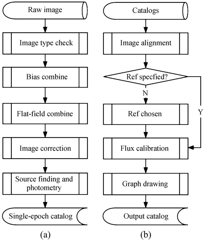 | 图 1 程序模块示意图。(a)单图像处理;(b)多图像处理 Fig. 1 Modules of the program. (a) The single-epoch image process; (b) the multi-epoch image process |