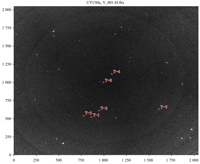 | 图 2 2022年5月14日利用兴隆观测站60 cm望远镜观测食双星UY UMa的V波段图像,图中标注的T-0为目标星,T-1至T-5为自动选择的参考星 Fig. 2 V-band image of the eclipsing binary UY UMa observed by Xinglong 60-cm telescope on May 14, 2022. The mark T-0 indicates the target star, and the marks T-1 to 5 are reference stars chosen by this program |