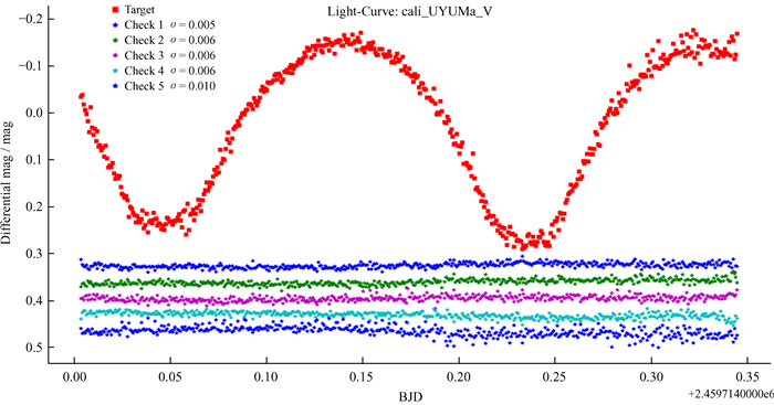 | 图 3 从2022年5月14日利用兴隆观测站60 cm望远镜观测食双星UY UMa的V波段数据中抽取出的光变曲线,其中红色方块为目标星光变曲线,星号为参考星光变曲线,编号顺序与图 2中所示一致 Fig. 3 V-band light-curve extracted from data of the eclipsing binary UY UMa observed by Xinglong 60-cm telescope on May 14, 2022. The red square marked curve shows the light-curve of the target star, while asterisk curves shows the reference stars, which have the same number in Figure 2 |