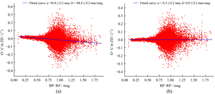 | 图 1 (a) 较差颜色折射改正前资料集3的残差随色指数的变化,蓝色实线表示(1) 式的拟合结果;(b) 较差颜色折射改正后的结果 Fig. 1 (a) the (O-C) residuals change with the color index BP-RP for observation set 3 before DCR correction, the blue line represents the fitted result of Equation 1; (b) the result after DCR |