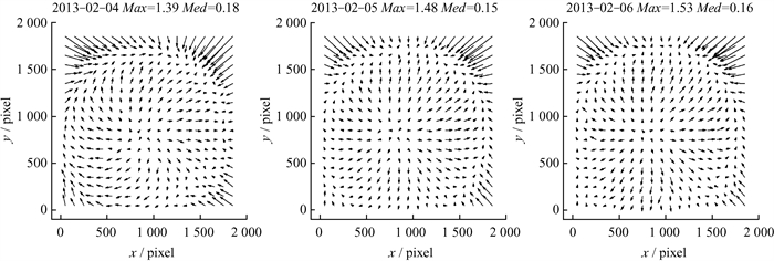 本文对10组资料进行了几何扭曲求解,图 2分别给出了每晚典型的几何扭曲矢量图(从左到右依次为资料集1,3,8)。我们使用四次多项式
