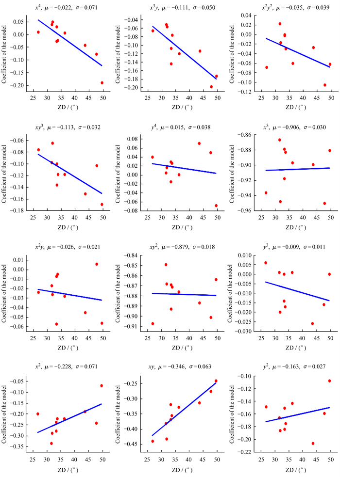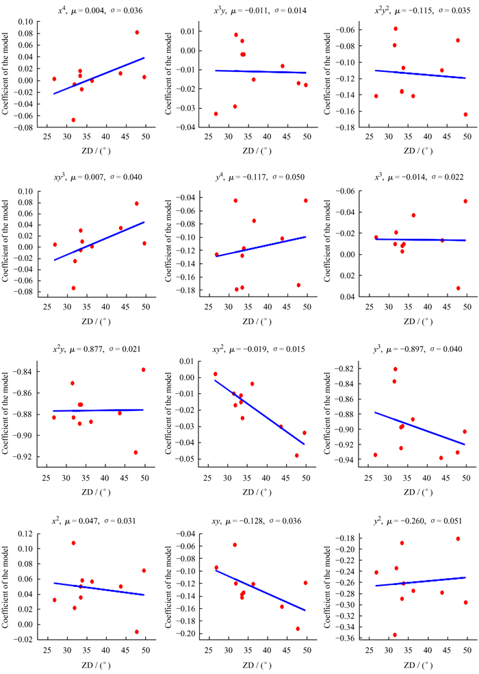 图 3和图 4分别给出了在x方向和y方向几何扭曲模型的四次项、三次项和二次项系数随天顶距的变化情况,并在每个子图的上方列出了系数项、系数的均值与标准差。我们初步发现三次项系数的标准差比较小,系数比较稳定,而四次项和二次项的某些系数随着天顶距的变化具有一定的规律。因此,我们通过线性拟合分析各项系数与天顶距的关系,图 3和图 4中蓝色实线为线性拟合的结果,表 5和表 6分别列出了拟合结果的皮尔森(Pearson)相关系数与标准差(SD) 的值。本文根据皮尔森相关性分析各项系数与天顶距的相关强度,皮尔森相关系数r为