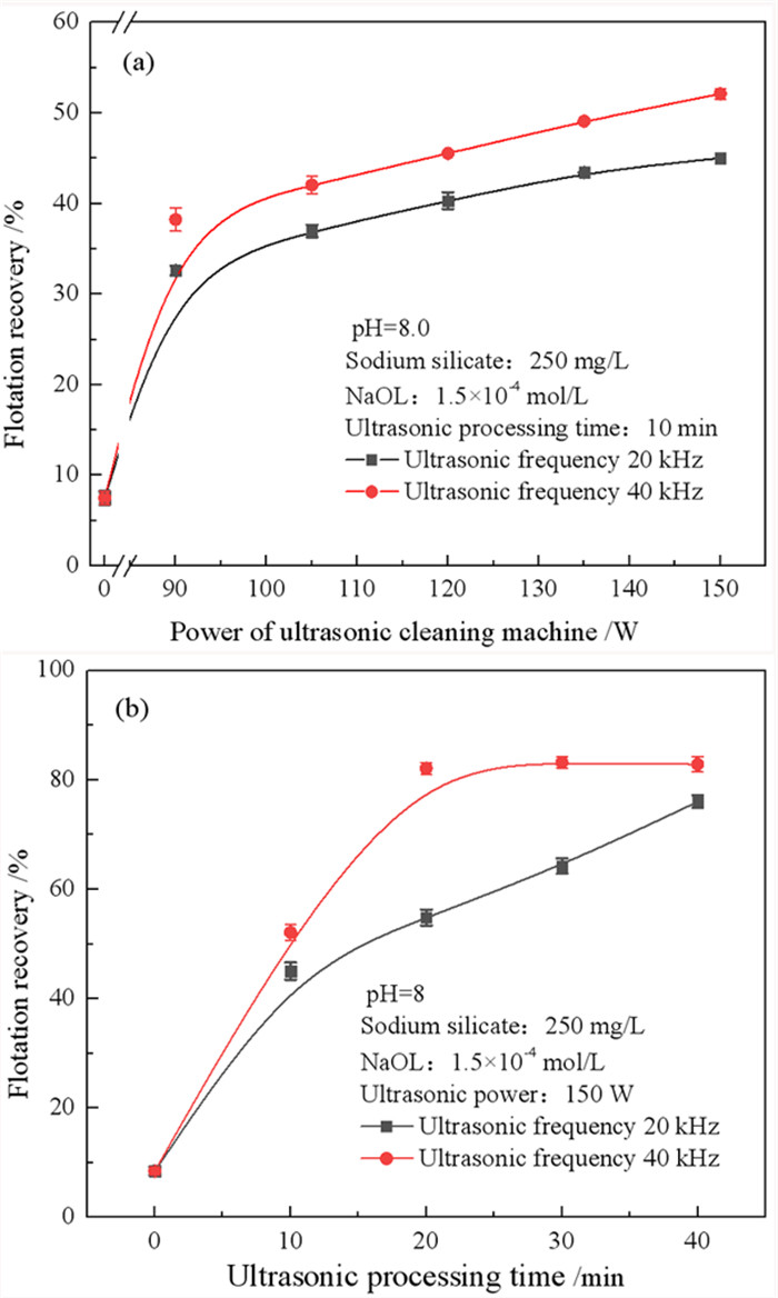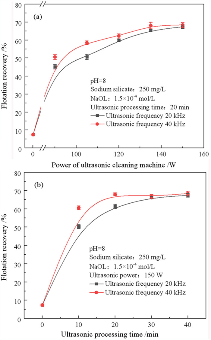 | 图 10 超声处理(超声波清洗机功率(a)和超声处理时间(b))水玻璃对方解石浮选回收率的影响 Fig.10 Effect of ultrasonic treatment (ultrasonic cleaning machine power (a) and ultrasonic treatment time (b)) sodium silicate on calcite flotation recovery |