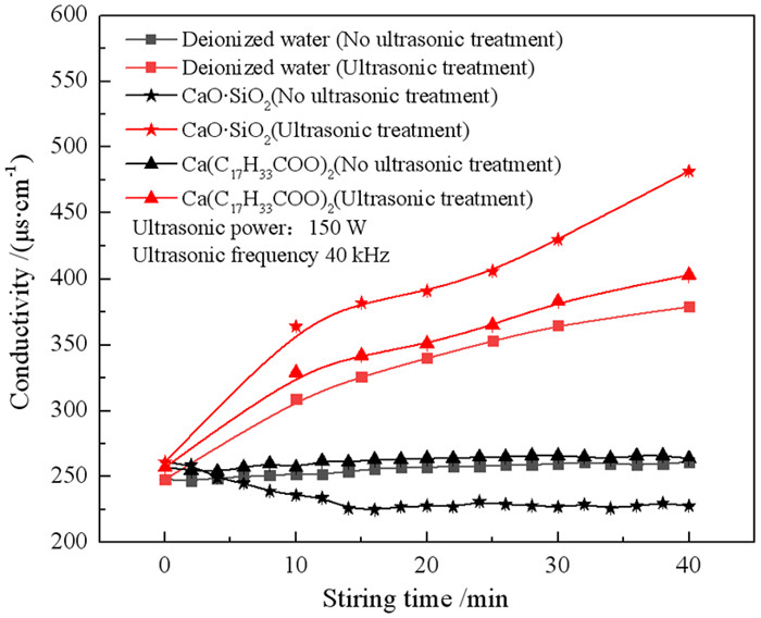 | 图 11 超声处理对去离子水、硅酸钙溶液和油酸钙溶液电导率的影响 Fig.11 Effect of ultrasonic treatment on the conductivity of deionized water, calcium silicate solution and calcium oleate solution |