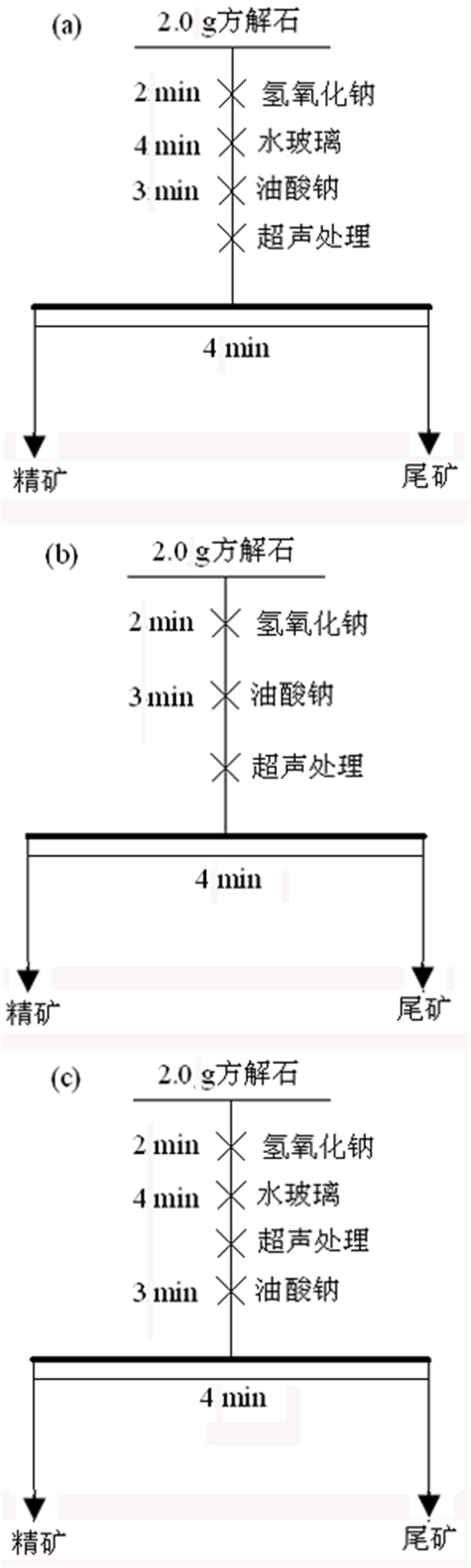 浮选试验流程如图 2所示,取2.0 g方解石置于40 mL浮选槽中并加入35 mL去离子水,矿浆经依次加药调浆后连同浮选槽一起置于超声波清洗机中进行超声处理并搅拌,结束超声处理后进行浮选刮泡,然后将浮选精矿、尾矿分别抽滤、烘干并称重。浮选回收率按式(1)计算: