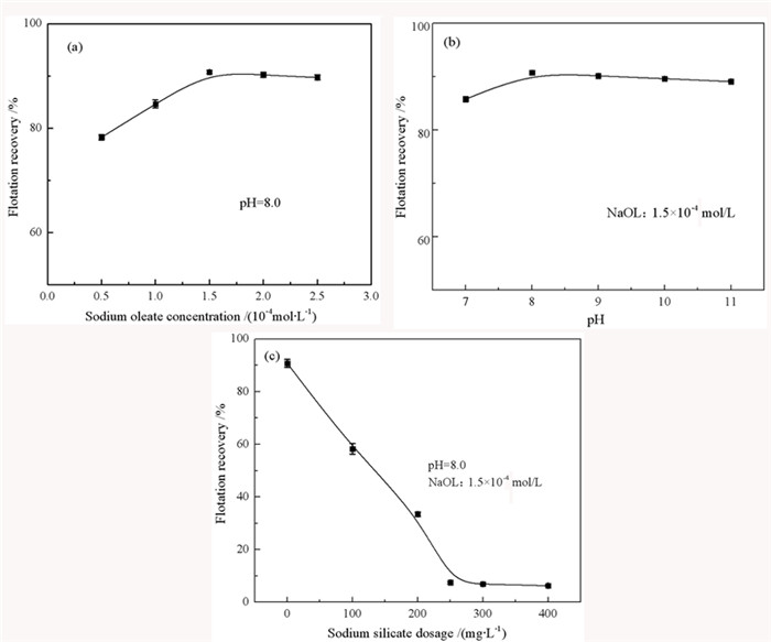 | 图 3 油酸钠浓度(a)、pH(b)、水玻璃浓度(c)对方解石的浮选回收率的影响 Fig.3 Effect of sodium oleate concentration (a), pH(b) and sodium silicate dosage (c) on flotation recovery of calcite |