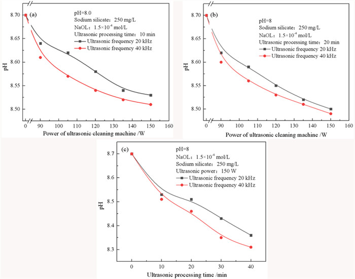 3.3 超声处理对矿浆pH值的影响初始pH=8.0,加入水玻璃250 mg/ L、油酸钠1.5×10-4 mol/L后,由于药剂的水解,矿浆pH值升高至8.7。图 5为超声波清洗机功率、频率及超声处理时间对矿浆pH值的影响。