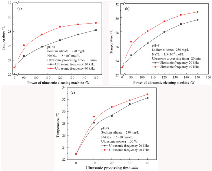 在pH=8.0、水玻璃用量250 mg/L、油酸钠用量1.5×10-4 mol/L时,超声波清洗机功率、频率及超声处理时间对矿浆整体温度的影响如图 7所示。