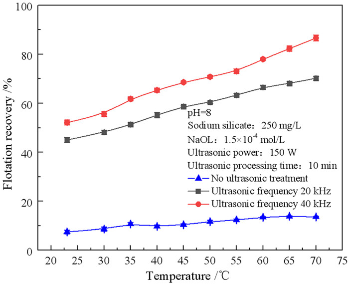 图 8表明,无超声处理时,随着超声波清洗机水介质温度由23 ℃提高到70 ℃,方解石的浮选回收率仅略有上升,结合图 7结果可知,仅由超声波引起的浮选矿浆整体温度变化对受抑制方解石可浮性影响很小。超声条件下提高超声波清洗机水介质温度对改善方解石的可浮性有协同作用,这可能是温度上升后,介质黏度降低,超声波空化效应更易发生所致[13-14]。本研究中超声处理时间为10 min、超声波功率150 W条件下,随着水介质温度由23 ℃提高到70 ℃,超声波频率20 kHz时方解石的浮选回收率从45.0%增加到70.1%,超声波频率40 kHz时方解石的浮选回收率从52.0%增加到86.2%。