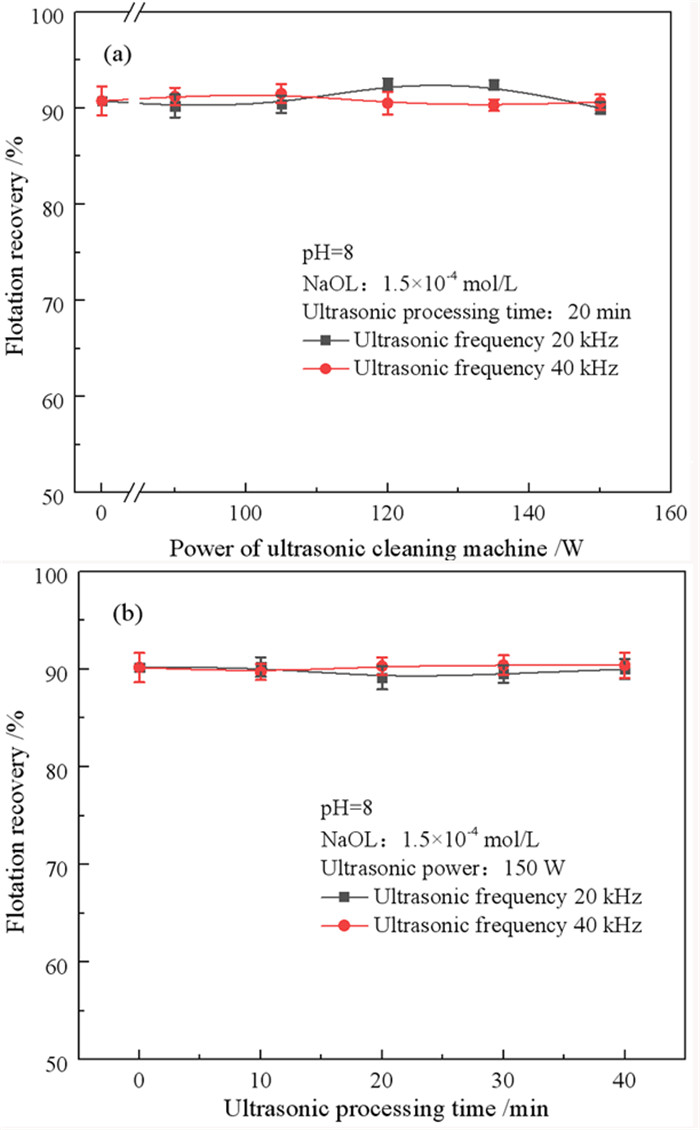 | 图 9 超声波清洗机功率(a)和超声处理时间(b)对油酸钠体系下方解石浮选回收率的影响 Fig.9 Effect of ultrasonic cleaning machine power (a) and ultrasonic treatment time (b) on calcite flotation recovery in sodium oleate system |
