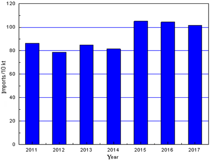 图 1 中国近年锆矿及锆英砂进口量 Fig.1 Histogram of China's zirconium ore and zircon sand imports in recent years |