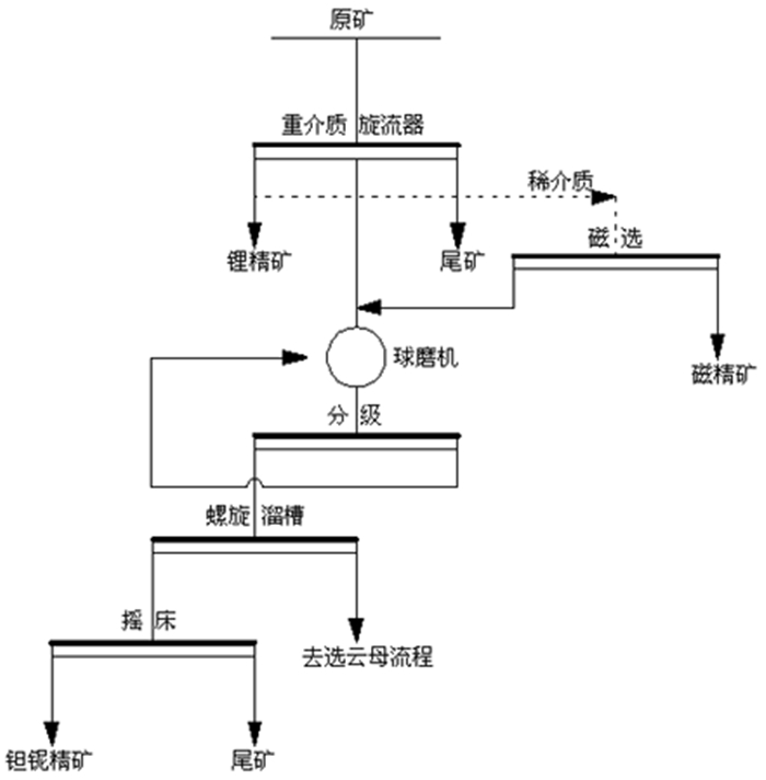 采用重介质旋流器一次粗选一次精选+重选粗精再磨螺旋溜槽重选工艺可获得化工级锂精矿,并且具有以下优点:磨矿量减少,能耗降低、无浮选成本、分选粒度较粗、无脱泥环节、矿石损失率低和锂精粉粒度粗有利于锂盐的提取和加工。但改造后工艺也存在以下缺点:锂精矿和钽铌铁矿未实现同时富集,导致钽铌损失,产品通过筛分脱除介质的同时产生-0.5 mm粒级中矿和两段分选产出的重介粗选中矿,需进一步分选,以提取锂精矿和钽铌精矿。