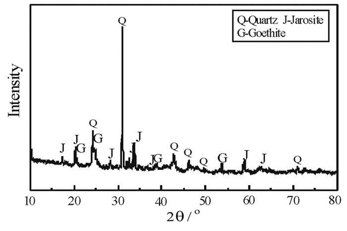 1 试验 1.1 试验原料试验原料取自内蒙古固阳地区,其化学成分和物相分析见表 1和表 2,图 1是原矿的XRD图谱。使用制样机将褐铁矿全部磨至0.074 mm以下,放入干燥箱中加热至110 ℃烘干12 h,去除其中的游离水。