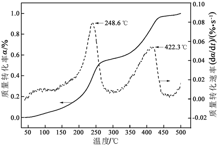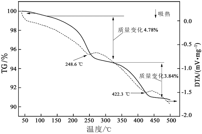 1.2 试验方法采用德国NETZSCH公司的STA-2500型热重分析仪对样品质量及热量的变化进行测定,试样质量为11 mg,在氮气气氛下,设定载气流量为20 mL/min,升温速率为10 ℃/min,升温区间为40~500 ℃,试验数据由计算机输出。采用丹东通达科技公司的TD 3500型X射线衍射仪对样品进行物相检测,使用Co靶,波长为1.79 Å,扫描范围为10°~80°,使用Jade软件进行物相分析。